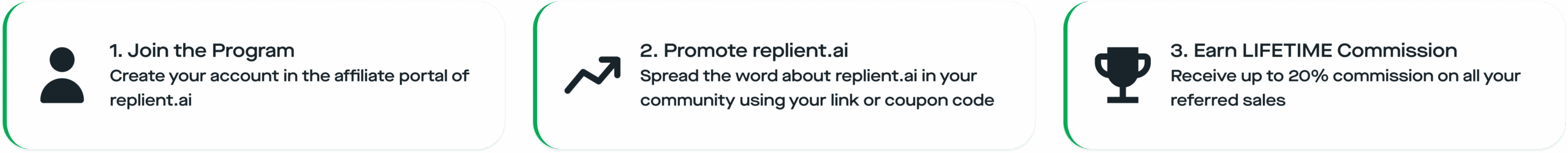 Vi accepterar endast affiliates som aktivt marknadsför replient.ai genom eget innehåll eller direkta rekommendationer .